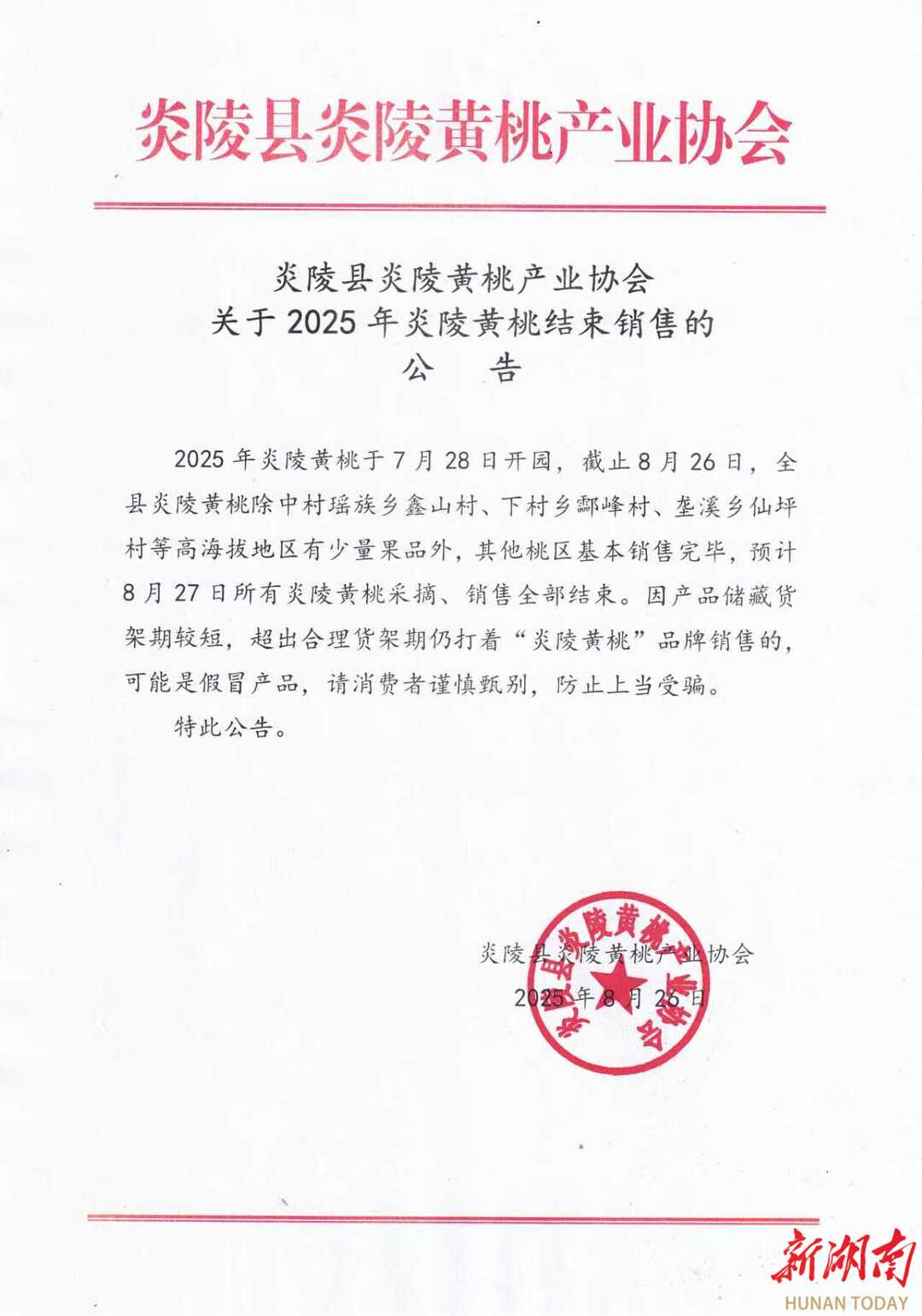 湖南日报·新湖南客户端8月26日讯(记者 张咪 通讯员 张和生)今天,炎陵县炎陵黄桃产业协会发布关于 2025 年炎陵黄桃结束销售的公告,炎陵黄桃即将结束销售。