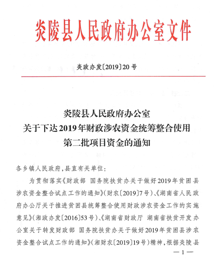 关于下达2019年财政涉农资金统筹整合使用第二批项目资金的通知--炎政办发【2019】20号