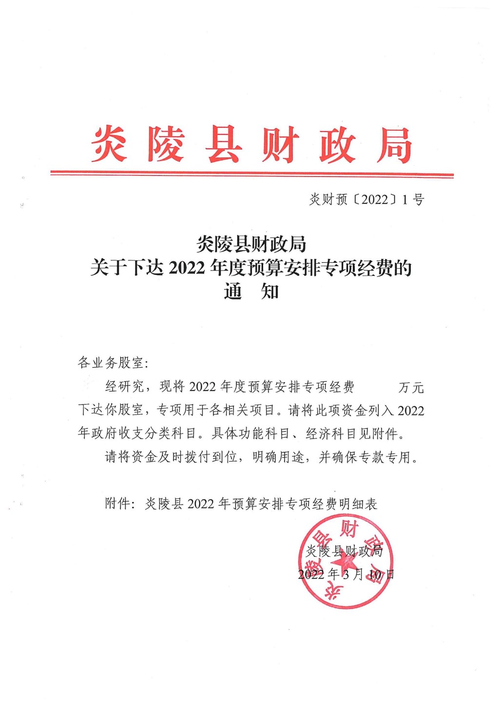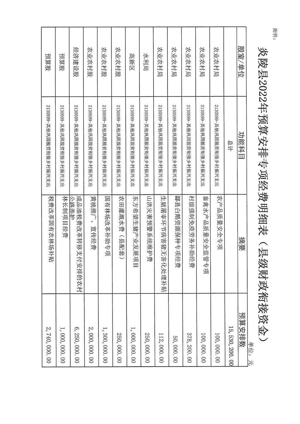 2022年预算安排专项经费明细表(县级财政衔接资金)