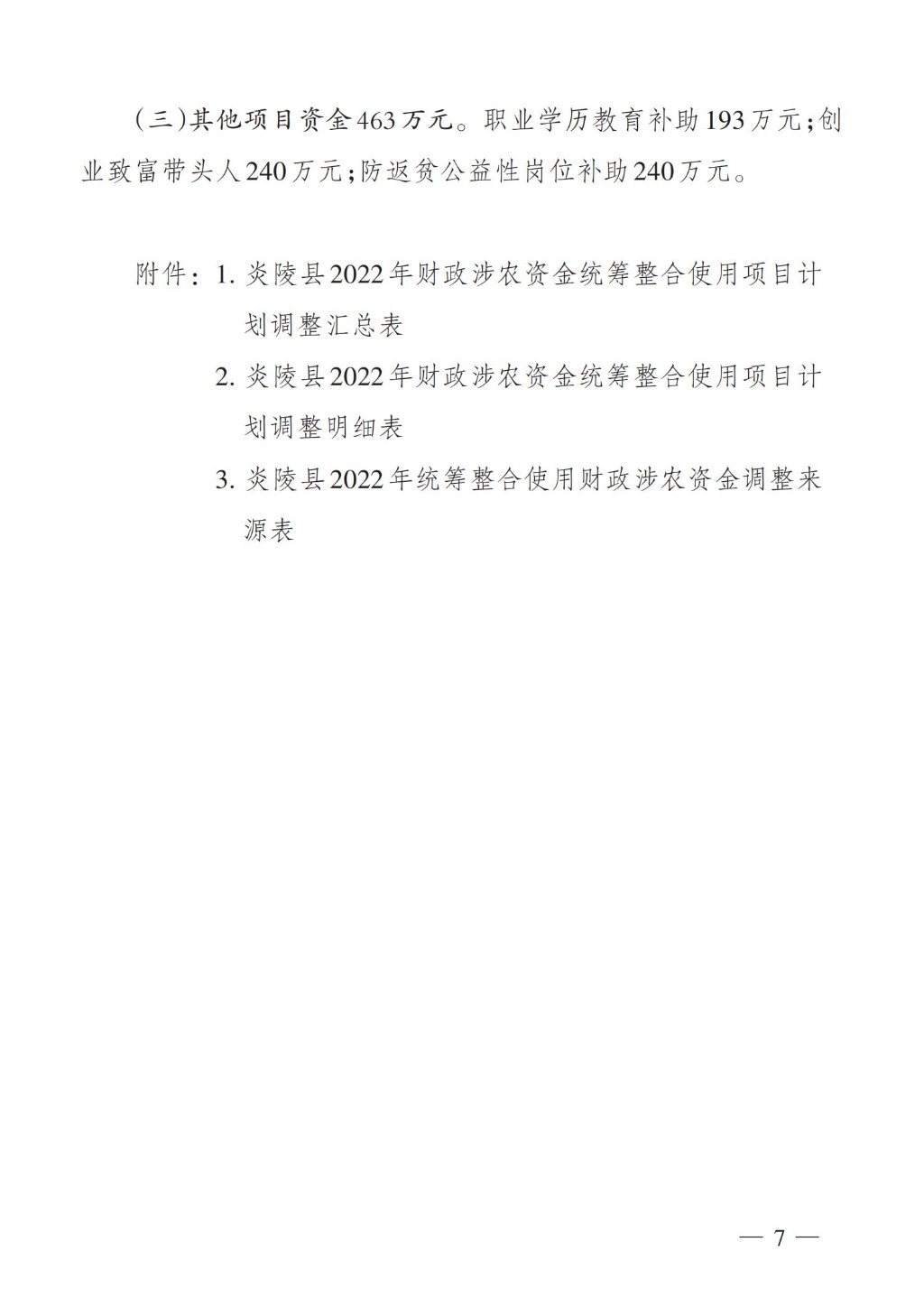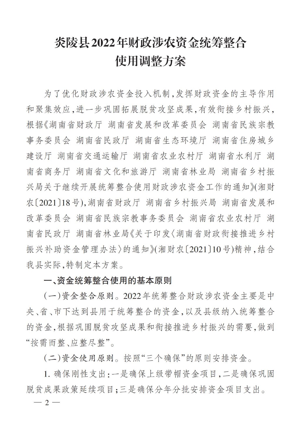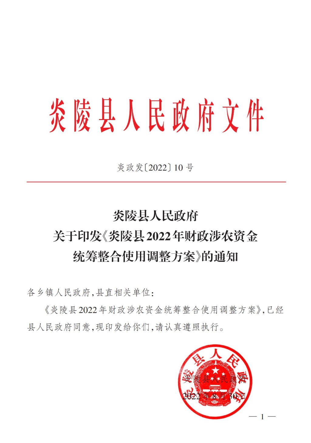 文件下载:关于印发《炎陵县2022年财政涉农资金统筹整合使用调整方案》的通知