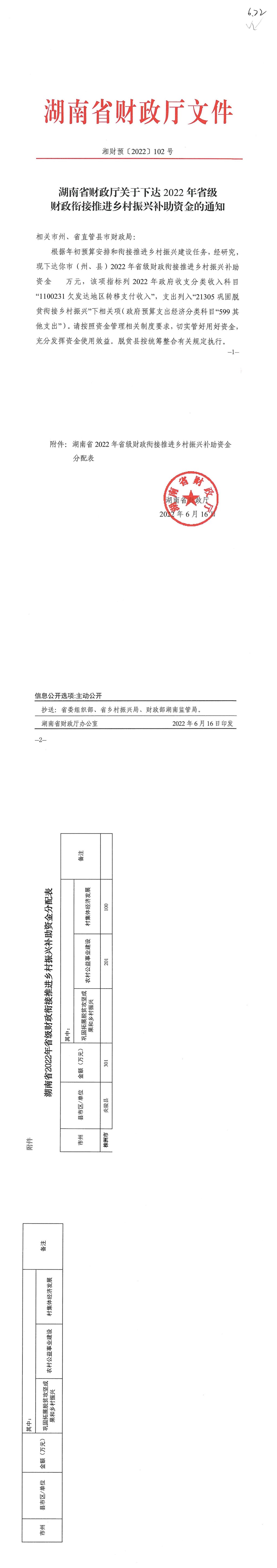 湖南省财政厅关于下达2022年省级财政衔接推进乡村振兴补助资金的通知(湘财预〔2022〕102号)