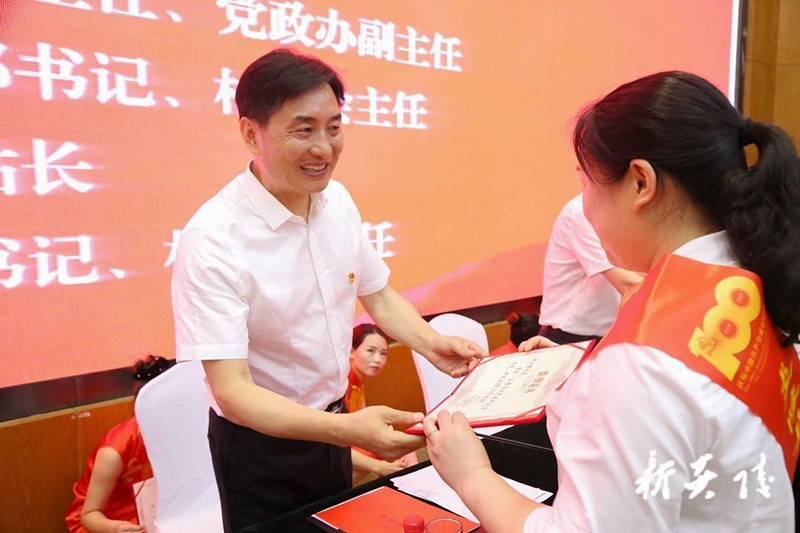 ▲县委书记尹朝晖为优秀共产党员、优秀党务工作者和先进基层党组织颁奖