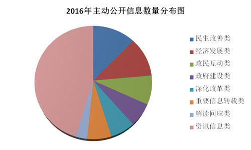 2016年,我县紧紧围绕2016年政务公开工作要点,累计主动公开政府信息32016条。其中,民生改善类3964条,占 12.23%;经济发展类信息3671条,占11.32%;政民互动类信息2691条,占8.30%;政府建设类信息2166条,占6.68%;深化改革类信息2149条,占6.63%;转载央网和省网重要信息2087条,占6.44%;解读回应类信息978条,占 3.02%;资讯信息类14710条,占45.38%。