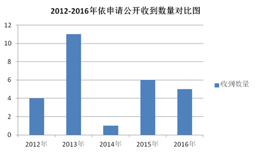 2016年我县政府及其工作部门经审查受理政府信息公开申请5,已答复5件。其中,按时办结4件,延迟办结1件;同意公开答复的3件,告知作出更改补充数2件。