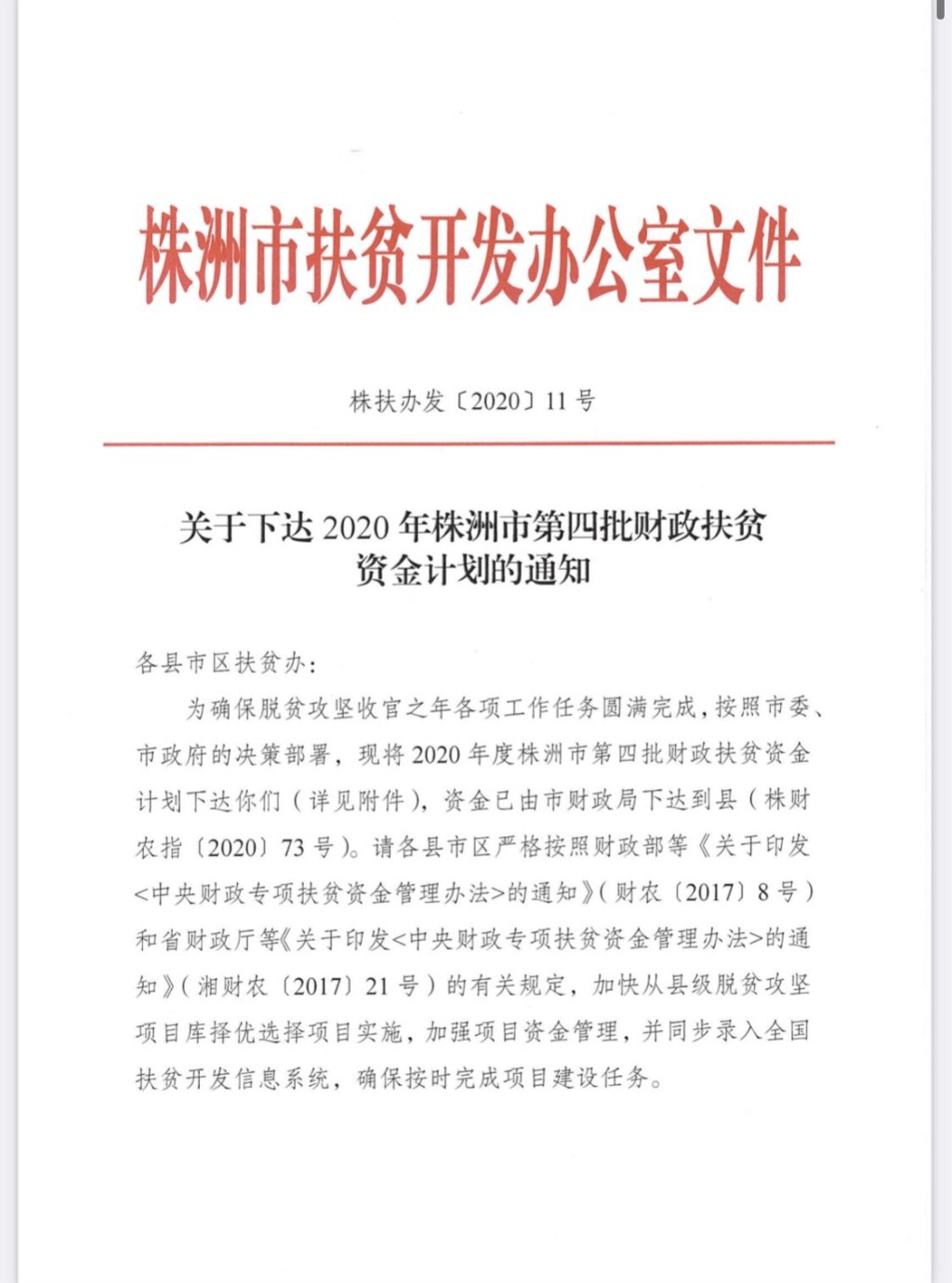 文件下载:关于下达株洲市2020年第四批财政扶贫专项资金计划的通知(株扶办发〔2020〕11号)