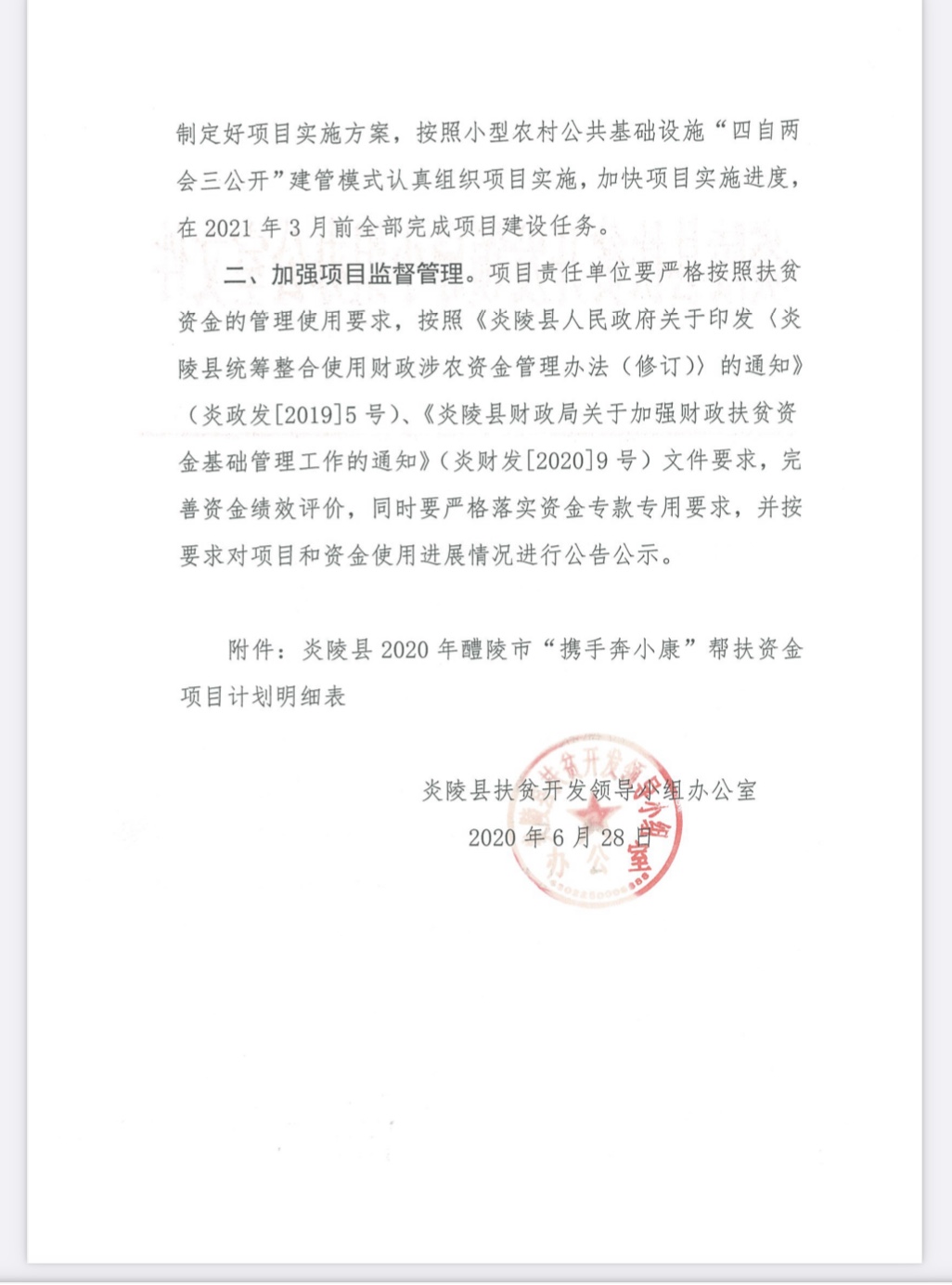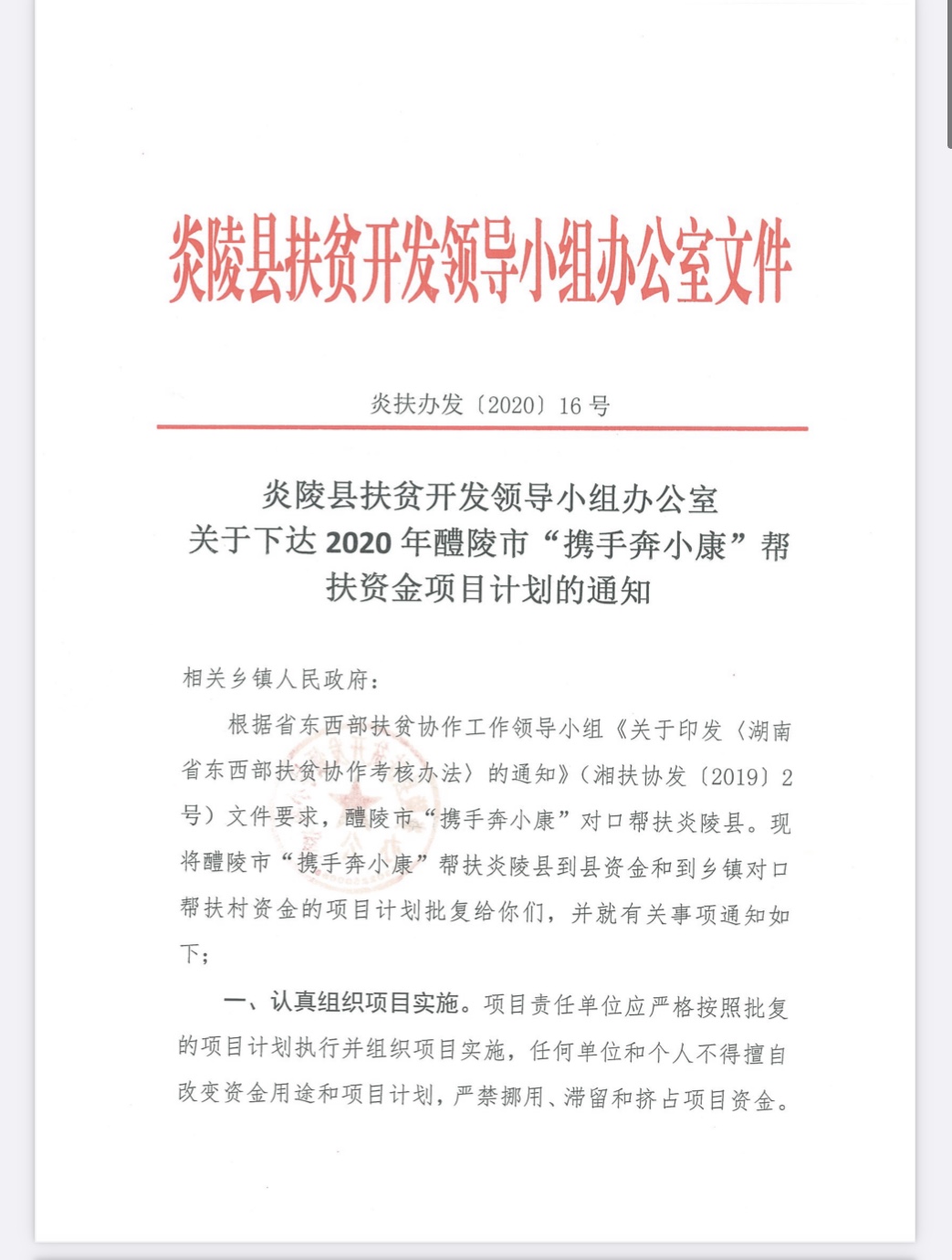 关于下达2020年醴陵市携手奔小康帮扶资金项目计划的通知