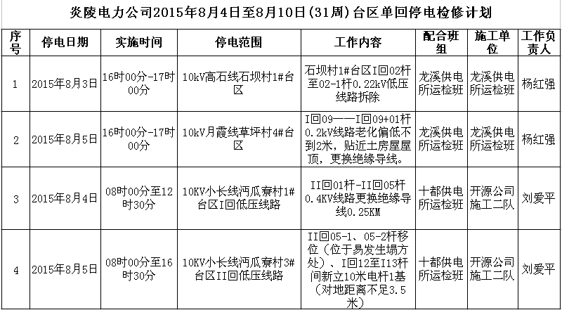 炎陵电力公司8月4日至10日停电检修计划(31周)