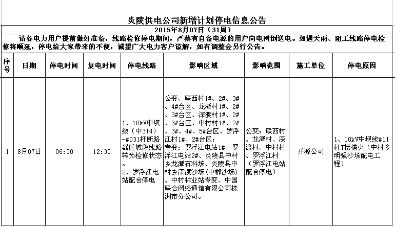 炎陵供电公司8月7日新增计划停电信息(31周)