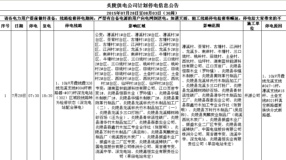 炎陵供电公司7月28日至8月3日计划停电信息公告