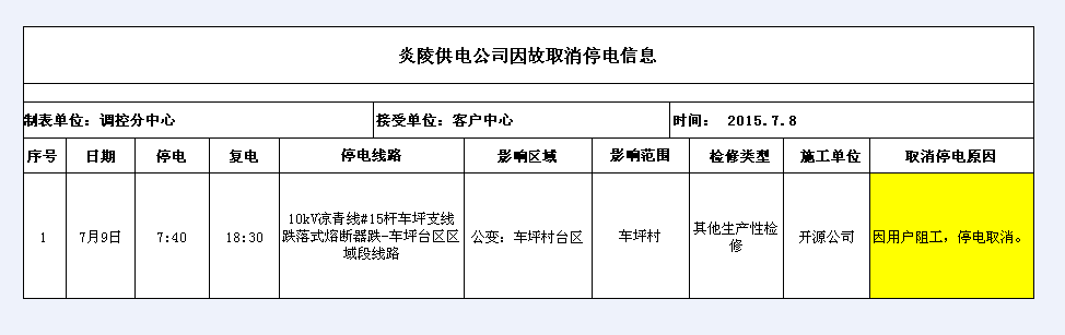 炎陵供电公司7月9日因故取消停电信息