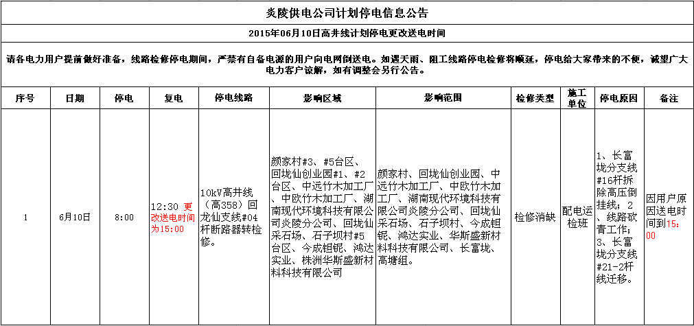 炎陵供电公司计划停电信息公告