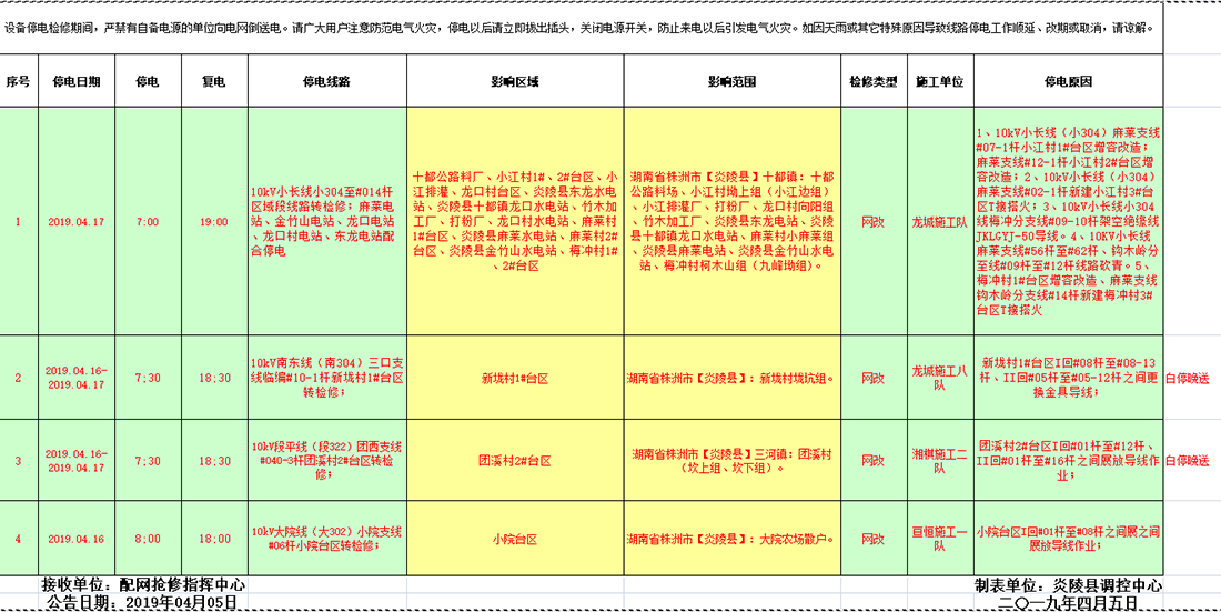 炎陵县供电公司2019年4月16、17日计划检修停电安排(公告)