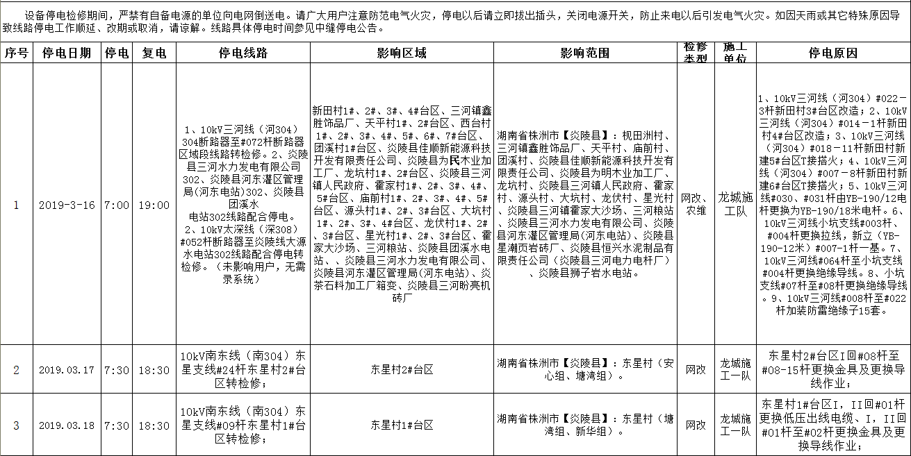 炎陵县供电公司2019年3月16日至3月18日计划检修停电安排公告