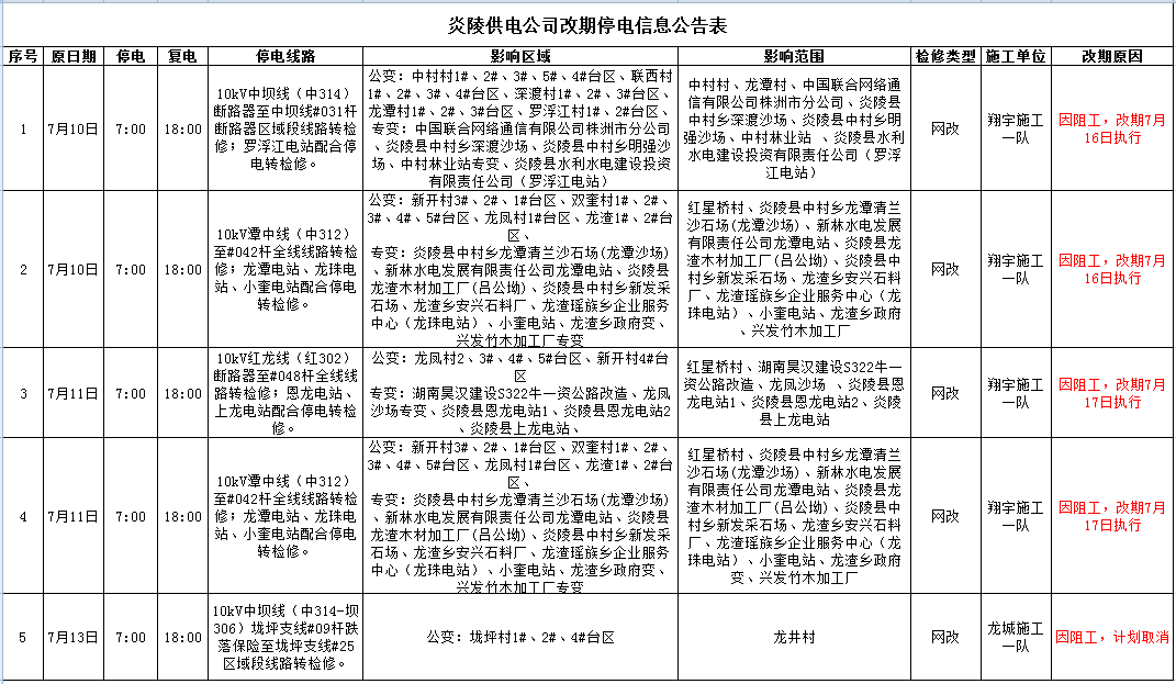 炎陵电网7月17日至23日改期停电信息公告表(29周)