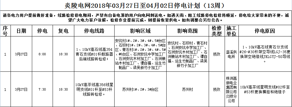 3月27日至4月2日停电计划(13周)