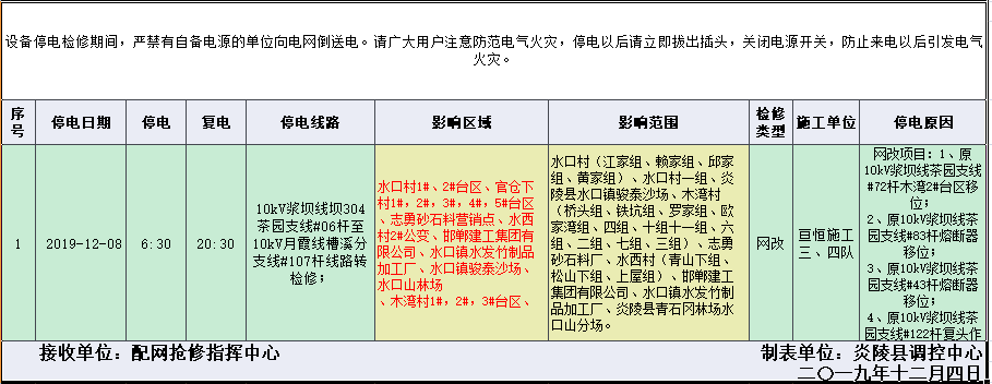 炎陵县供电公司2019年12月8日计划检修停电安排