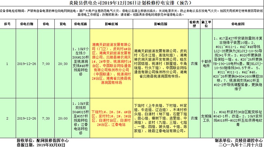 炎陵县供电公司2019年12月26日计划检修停电安排(预告)
