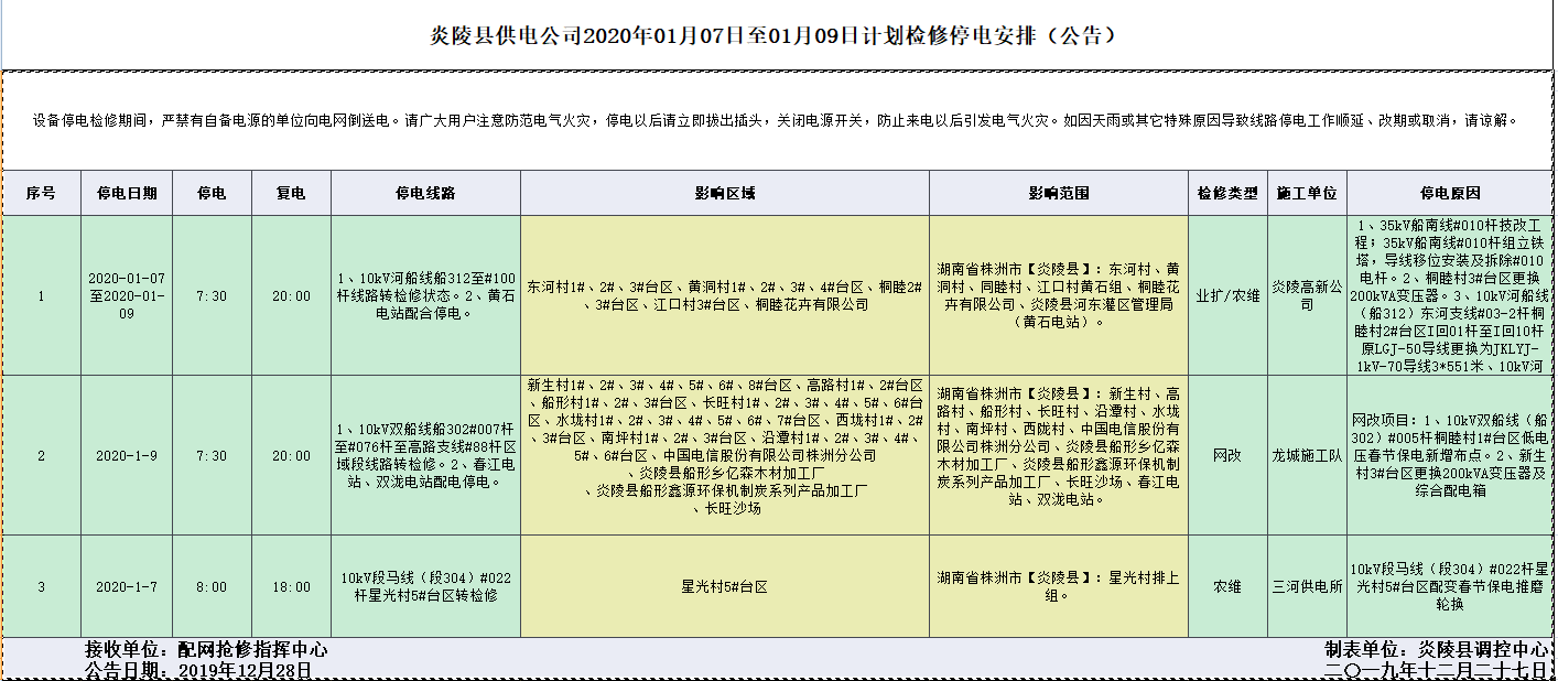 炎陵县供电公司2020年01月07日至01月09日计划检修停电安排