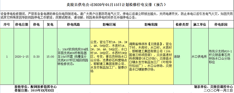 炎陵县供电公司2020年1月15日计划检修停电安排