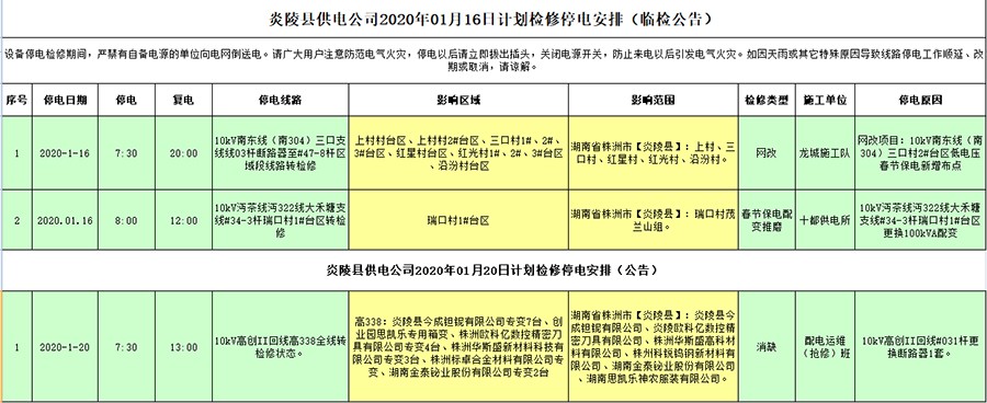 炎陵县供电公司2020年01月16日计划检修停电安排