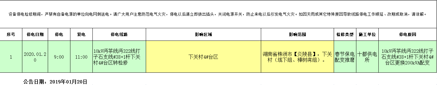 炎陵县供电公司2020年01月20日计划检修停电安排