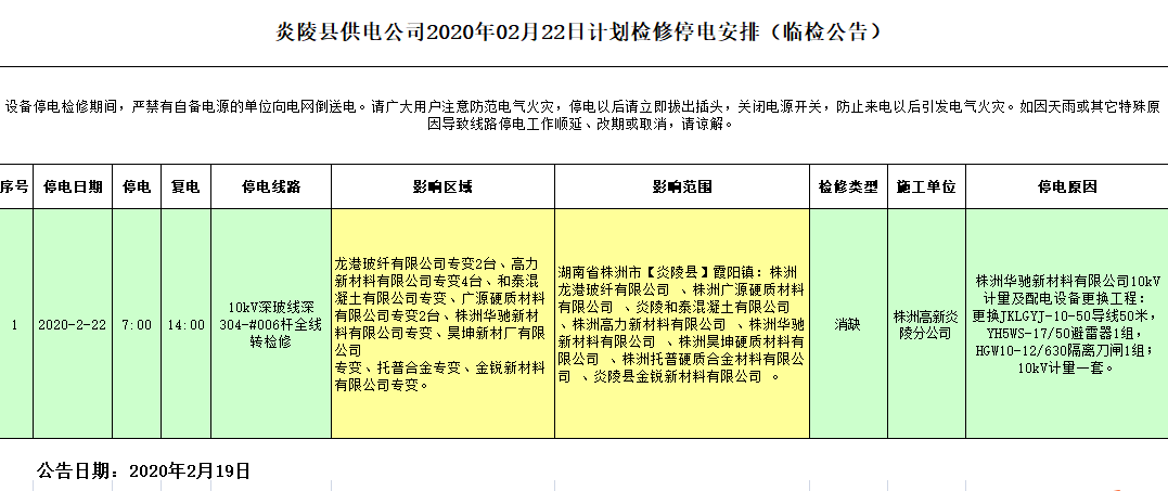 炎陵县供电公司2020年02月22日计划检修停电安排(临检公告)