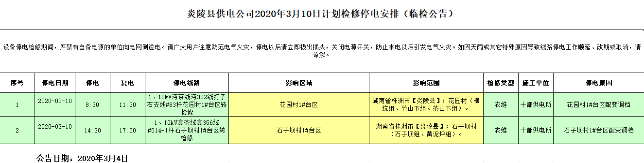 炎陵县供电公司2020年3月10日计划检修停电安排(临检公告)