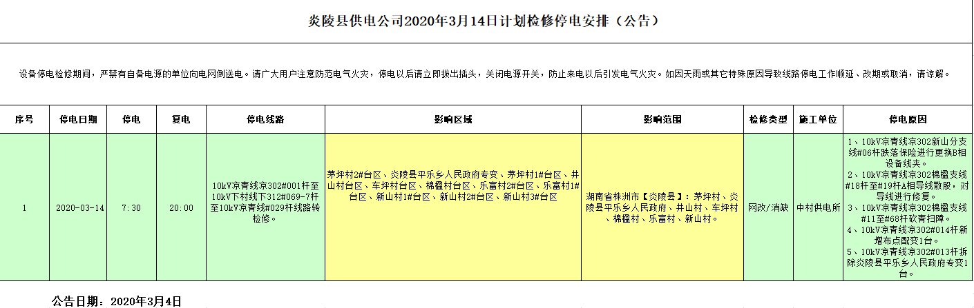 炎陵县供电公司2020年3月14日计划检修停电安排(公告)