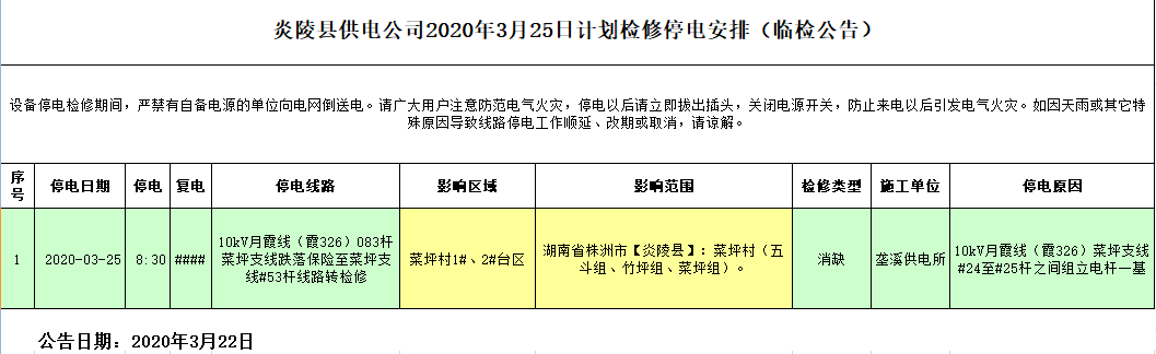 炎陵县供电公司2020年3月25日计划检修停电安排