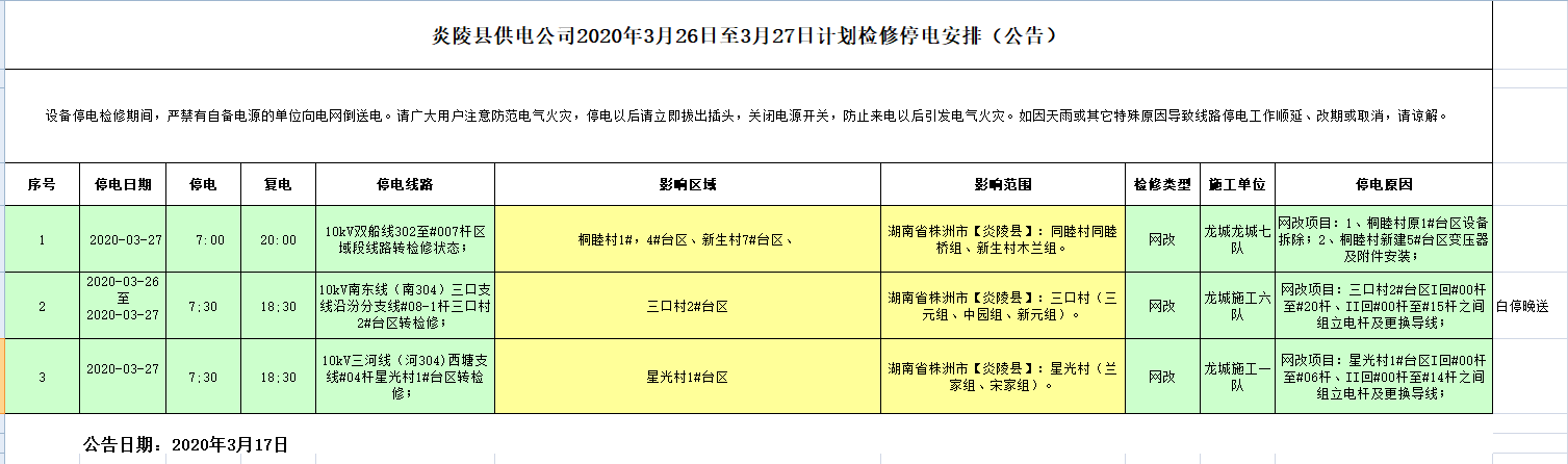 炎陵县供电公司2020年3月26日至3月27日计划检修停电安排