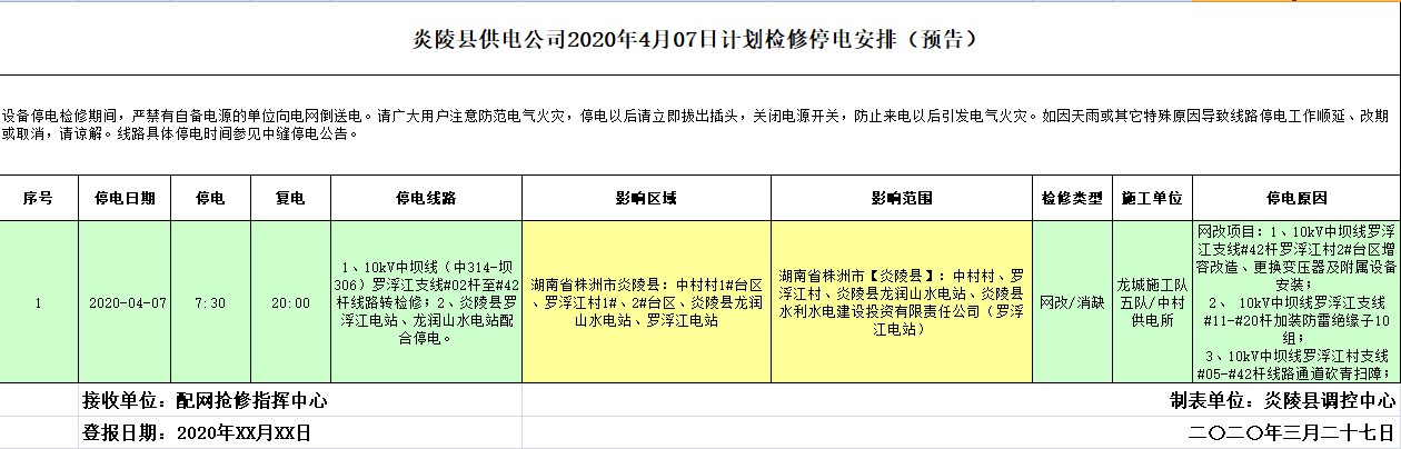 炎陵县供电公司2020年4月07日计划检修停电安排(预告)