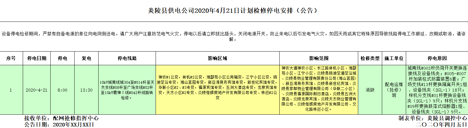 炎陵县供电公司2020年4月21日计划检修停电安排(公告)