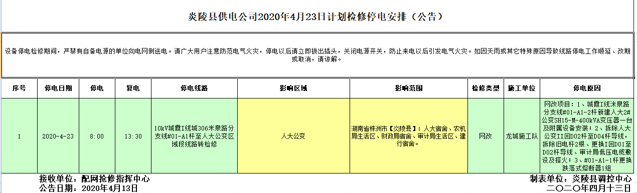 炎陵县供电公司2020年4月23日计划检修停电安排(公告)