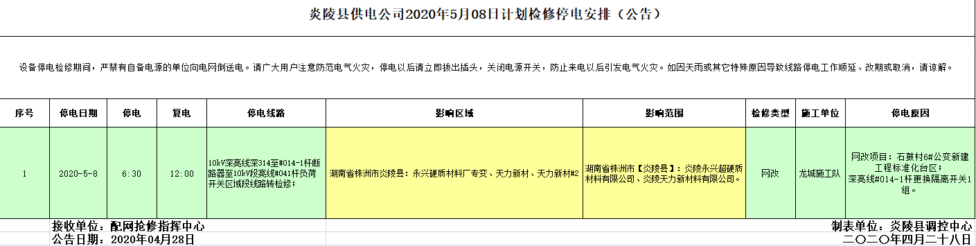 炎陵县供电公司2020年5月08日计划检修停电安排(公告)