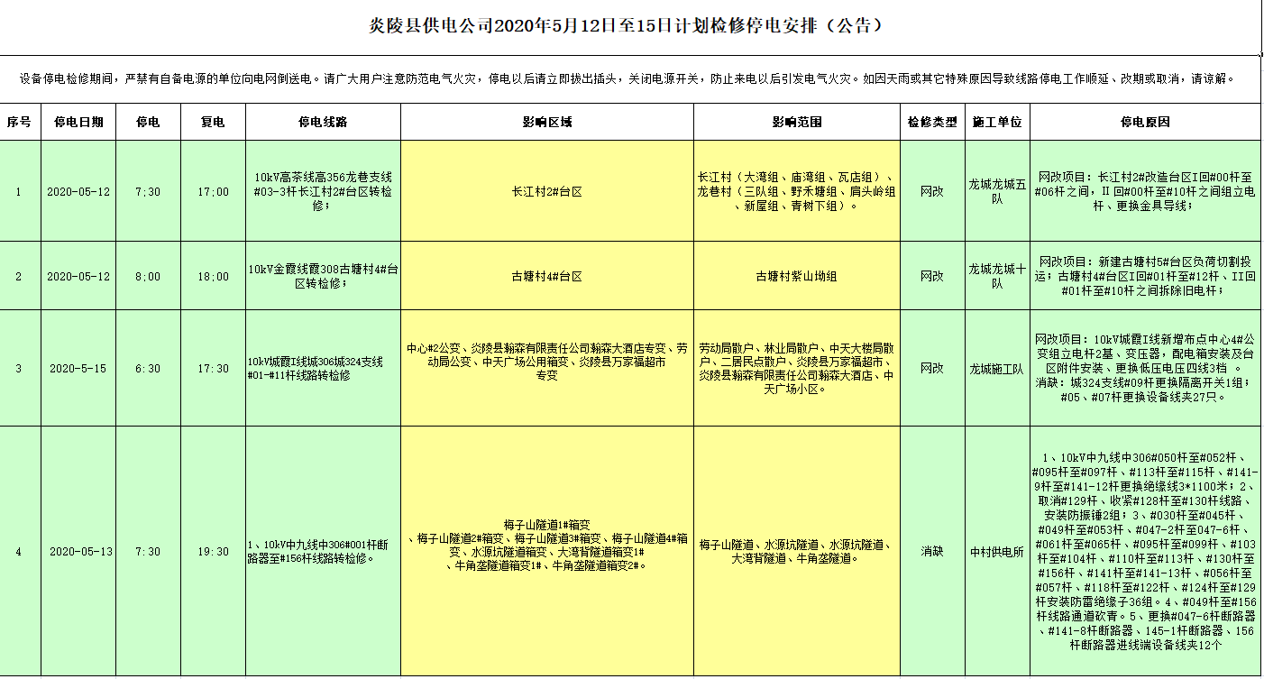 炎陵县供电公司2020年5月12日至15日计划检修停电安排(公告)