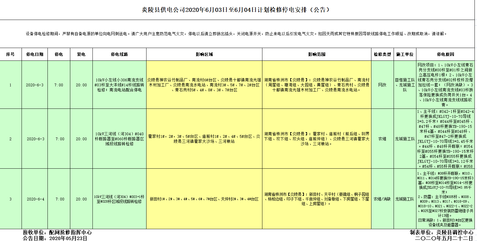 炎陵县供电公司2020年6月03日至6月04日计划检修停电安排(公告)