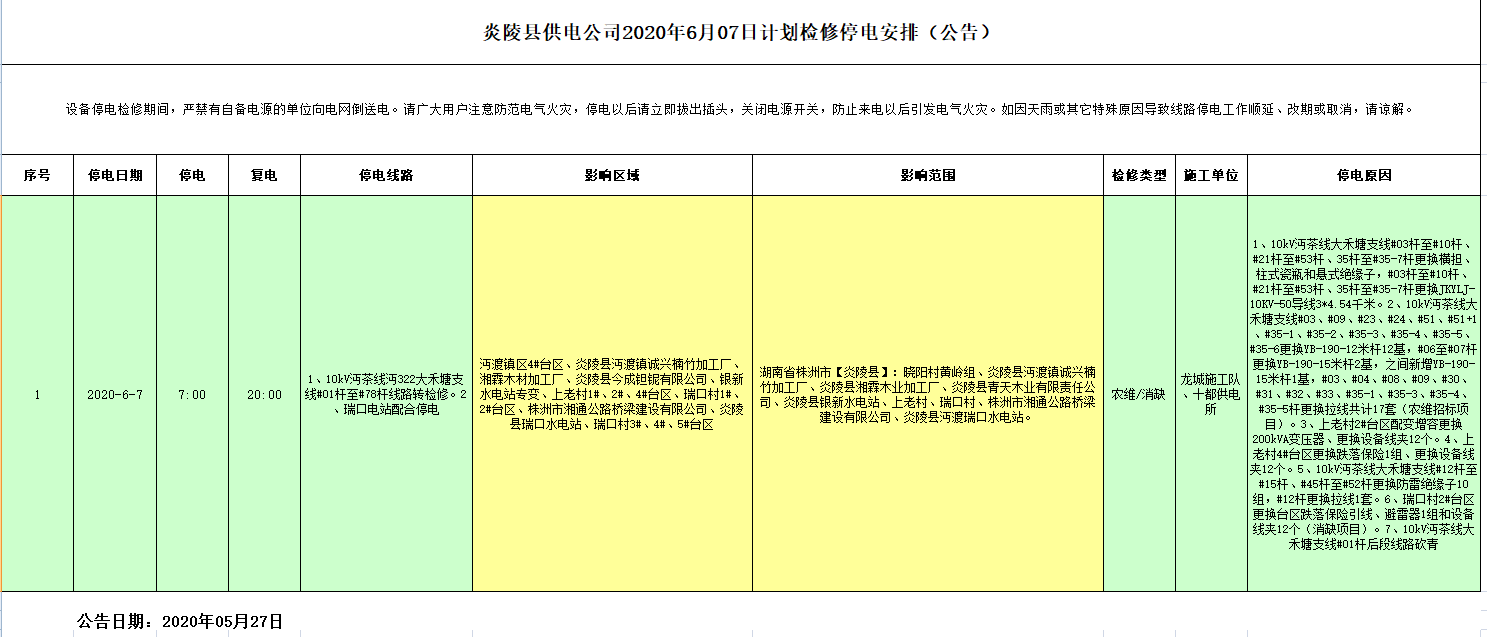 炎陵县供电公司2020年6月07日计划检修停电安排(公告)