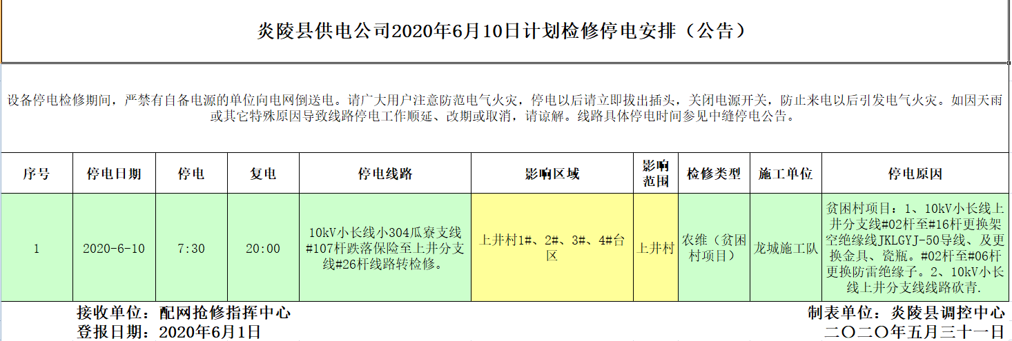 炎陵县供电公司2020年6月10日计划检修停电安排(公告)
