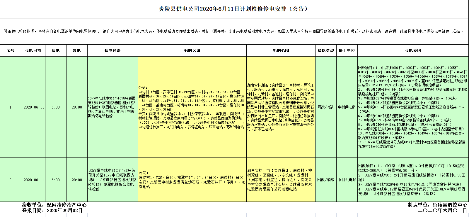 炎陵县供电公司2020年6月11日计划检修停电安排(公告)