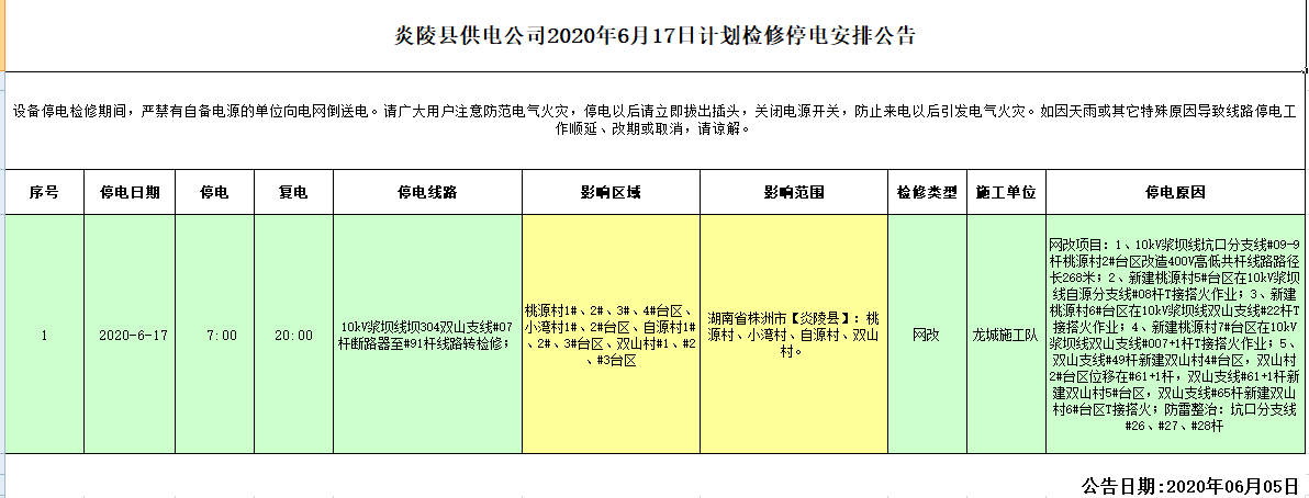炎陵县供电公司2020年6月17日计划检修停电安排公告