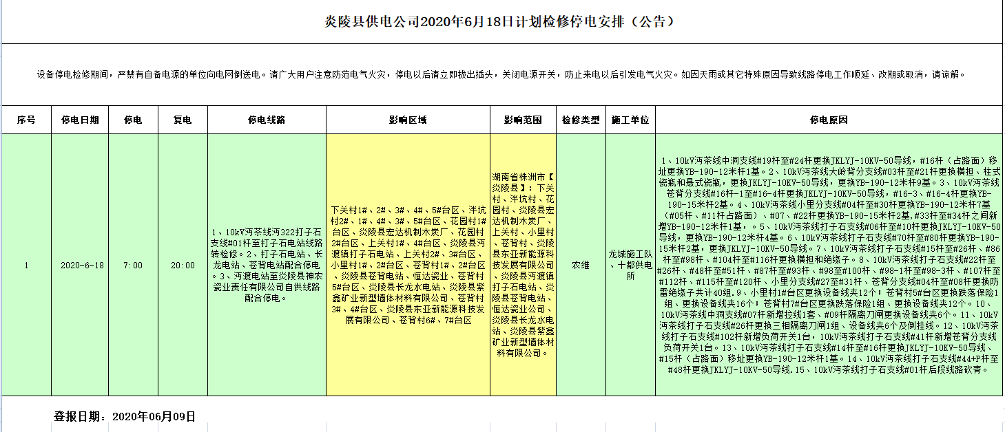 炎陵县供电公司2020年6月18日计划检修停电安排(公告)