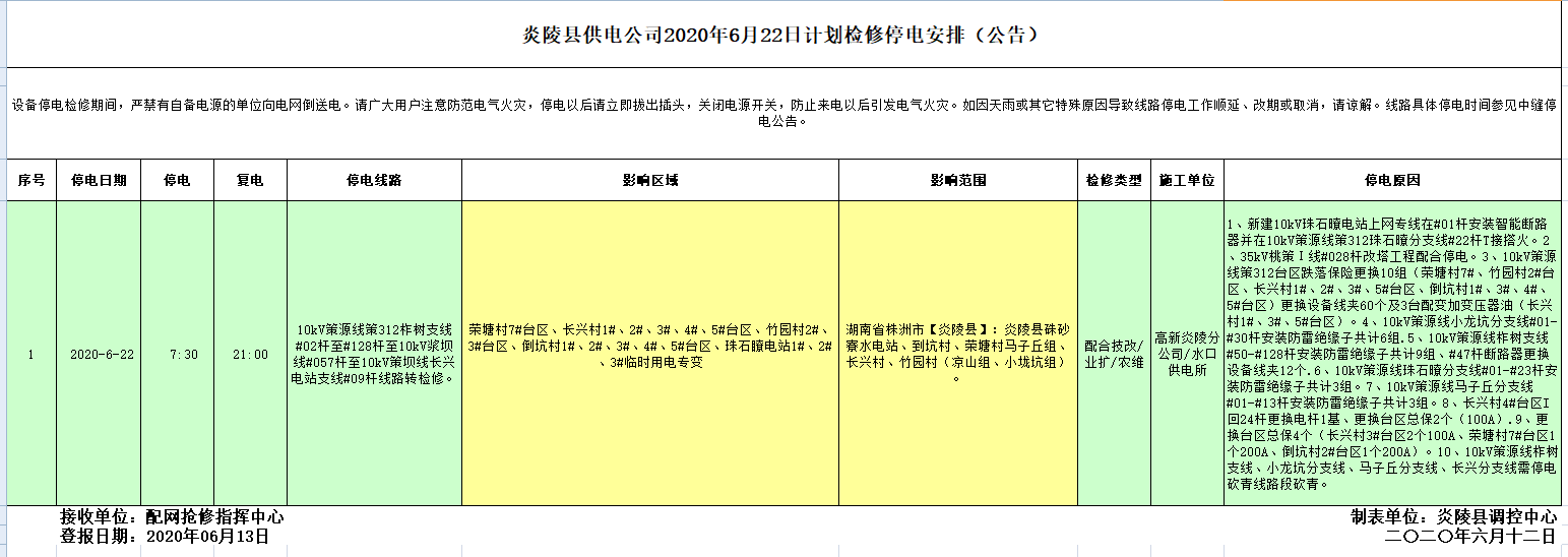 炎陵县供电公司2020年6月22日计划检修停电安排(公告)