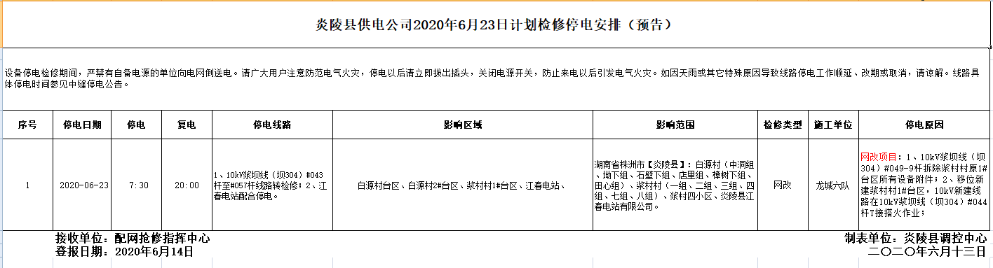 炎陵县供电公司2020年6月23日计划检修停电安排(预告)