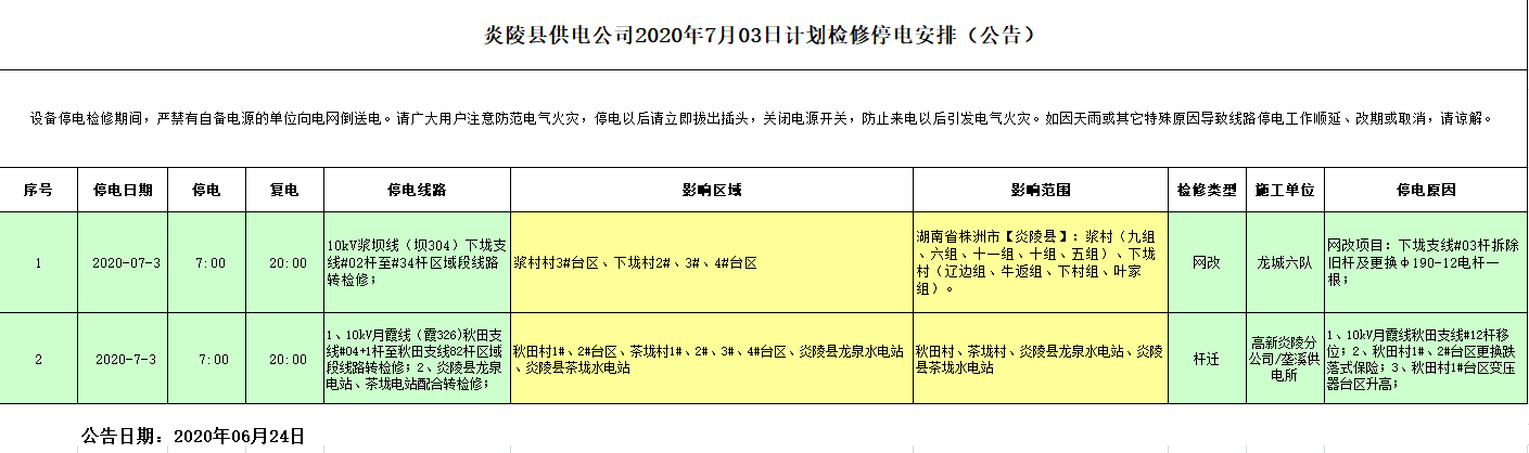 炎陵县供电公司2020年7月03日计划检修停电安排(公告)