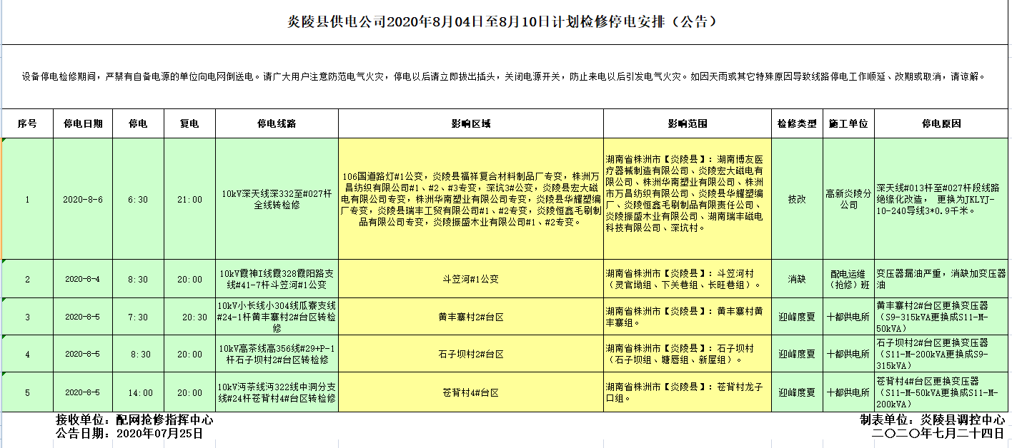 炎陵县供电公司2020年8月04日至8月10日计划检修停电安排