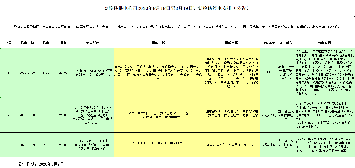 炎陵县供电公司2020年8月18日至8月19日计划检修停电安排