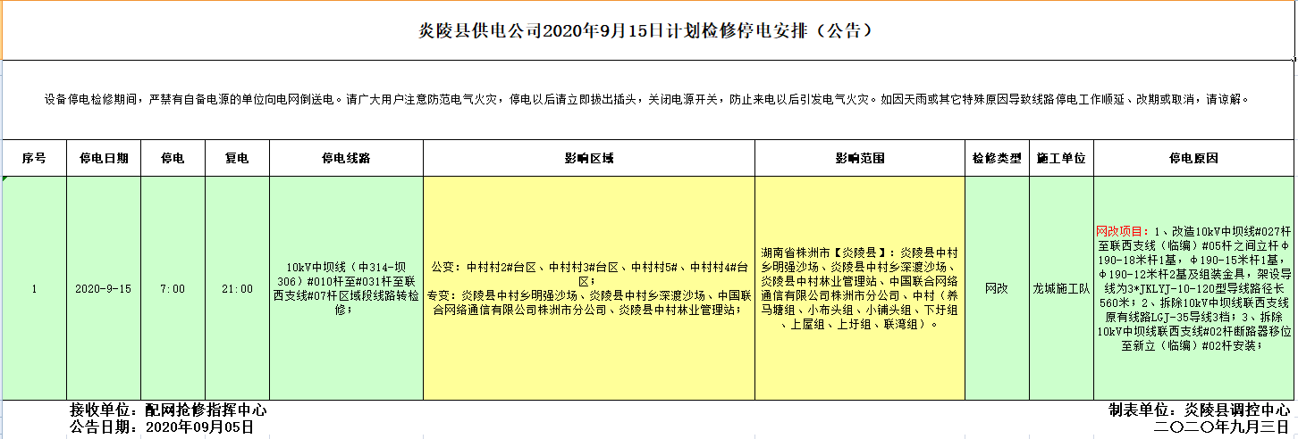 炎陵县供电公司2020年9月15日计划检修停电安排