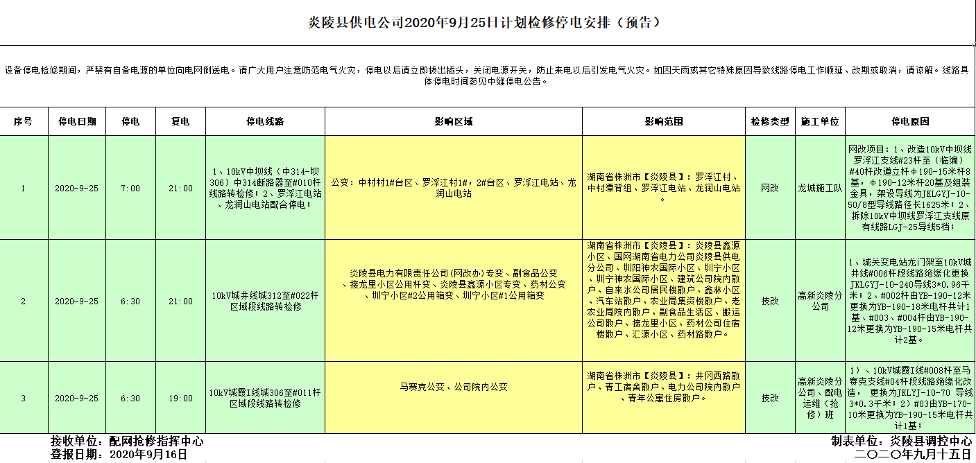 炎陵县供电公司2020年9月25日计划检修停电安排