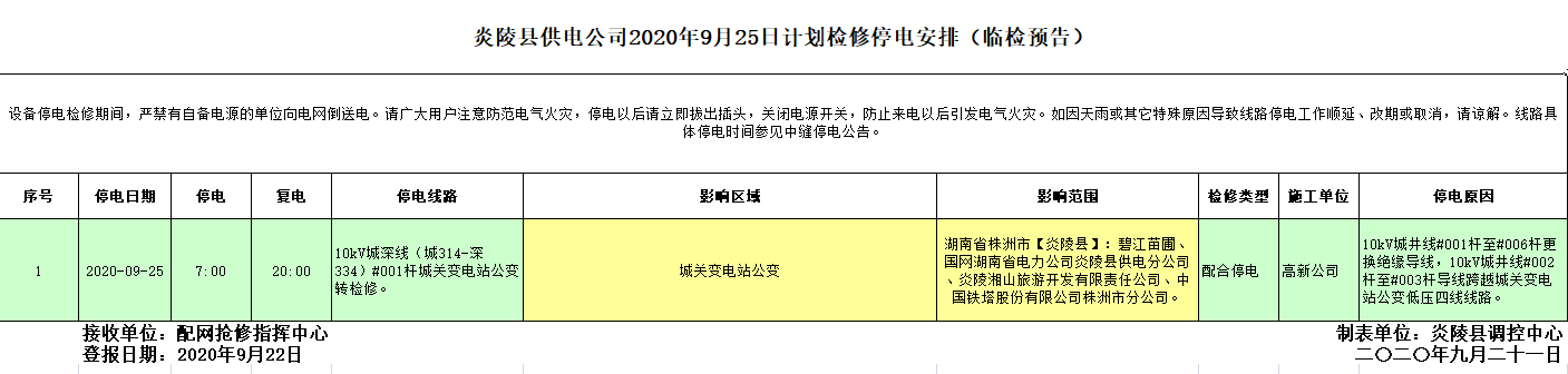 炎陵县供电公司2020年9月25日计划检修停电安排