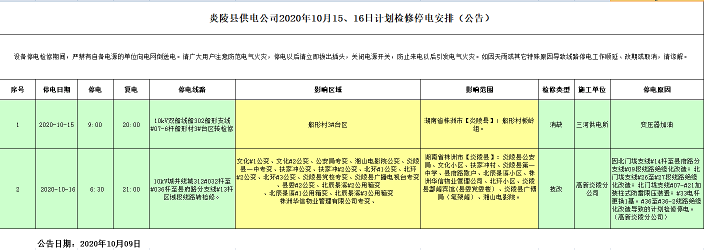 炎陵县供电公司2020年10月15、16日计划检修停电安排